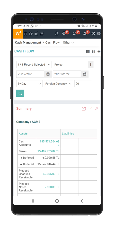 من خلال شاشات التدفق النقدي، يتم عرض التدفقات النقدية الشهرية واليومية والأسبوعية بيانيًا وعلى أساس جدول، مع فصل الدخل والمصروفات وفقًا لأنواع العمليات مثل سندات الشيكات وتحصيل بطاقات الائتمان والنفقات المدرجة في الميزانية. في التقارير الشهرية أو الأسبوعية أو اليومية، يمكنك أيضًا عرض جميع السجلات التي تحدث في الفترة الزمنية ذات الصلة وتشكيل جدول التدفق النقدي بنقرة واحدة.