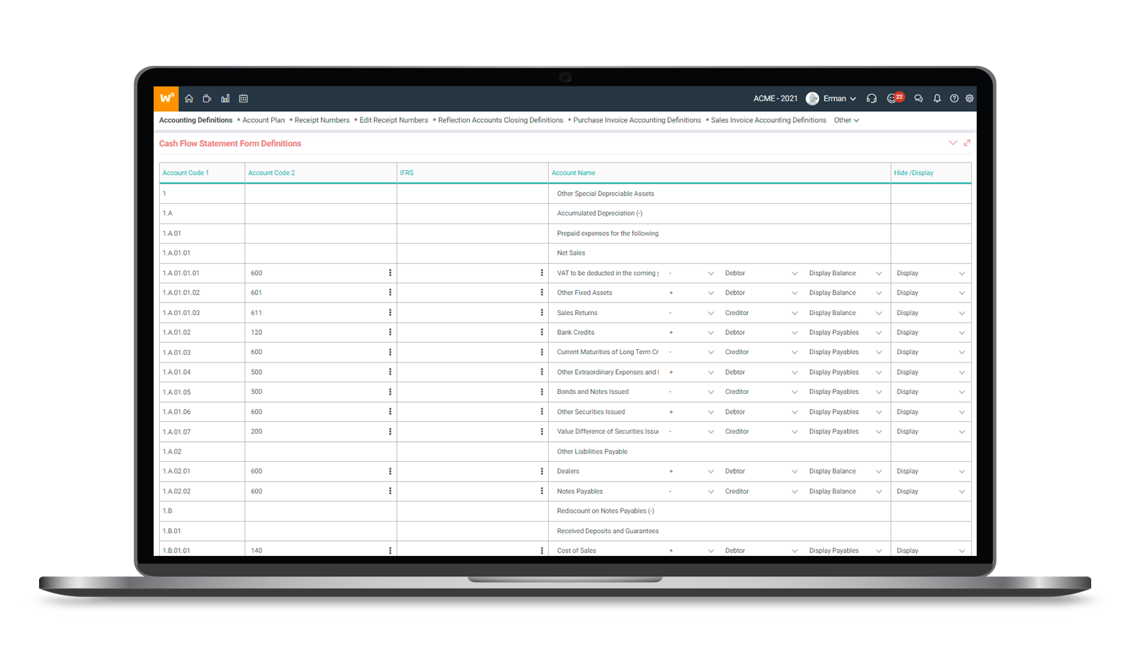 يتم وضع التعريفات اللازمة حتى تتمكن من إجراء المعاملات وفقًا لتعريفات نموذج بيان التدفق النقدي ورمز الحساب ورمز المعايير الدولية لإعداد التقارير المالية وأسماء الحسابات وحالة الدين والائتمان. يمكنك إظهار رموز الحساب التي تريدها في كشف التدفق النقدي.