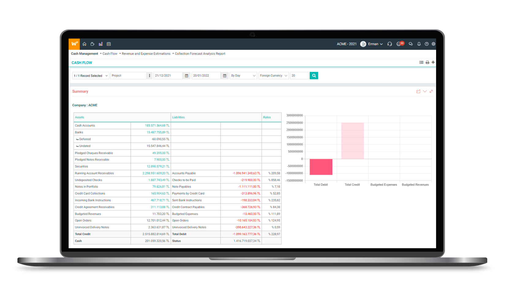 يعد التدفق النقدي علامة فارقة في إدارة تمويل وركيوب . يعرض الإيرادات والنفقات المتوقعة على شاشة واحدة، مما يسمح لك بتتبع التدفق النقدي الخاص بك. يمكنك تتبع المستقبل والماضي وإدارته. بالإضافة إلى معلومات الميزانية والفاتورة والدفع والتحصيل المسجلة في النظام بأكمله، يمكنك بسهولة التنبؤ بالمستقبل من خلال سيناريوهات متفائلة ومتشائمة لنفقاتك أو دخلك المتكرر، واتخاذ الإجراءات اللازمة في الوقت المناسب