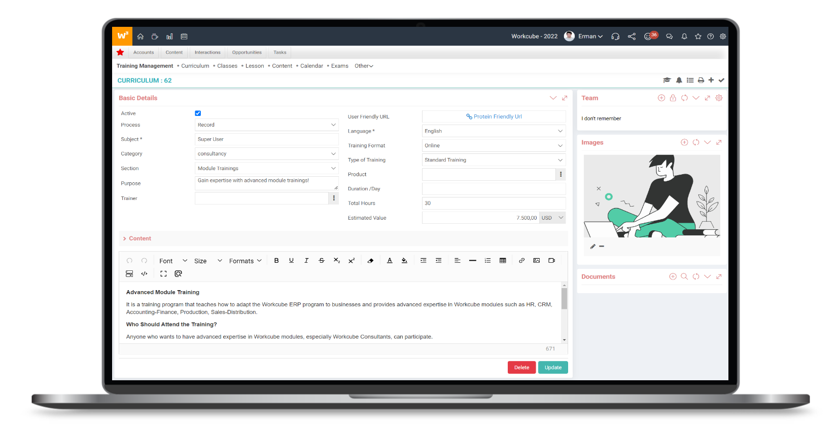 مع إدارة تدريب Workcube، من السهل إنشاء محتوى تدريبي مناسب لمختلف الميزات والوظائف، وفتح الدورات، وتسجيل المتدربين في الدورات، وعرض هذه الدورات تلقائيًا على شاشات كمبيوتر المتدربين.