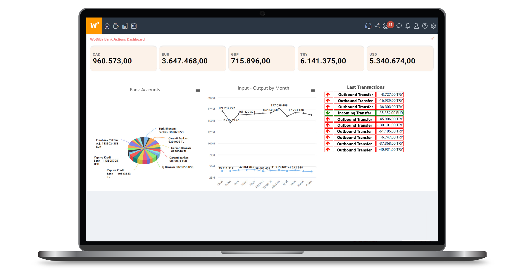 بفضل WoDiBa، يمكنك عرض وإدارة المعاملات والتعليمات والتقارير المتعلقة بالعديد من البنوك على منصة واحدة. وبالتالي، يمكنك توفير الوقت وزيادة جودة معاملاتك.